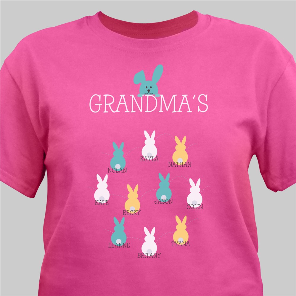 Great as an Easter Shirt For Grandma, Mom or another special person, this shirt can be personalized with any title and up to 15 names of all your favorite bunnies.