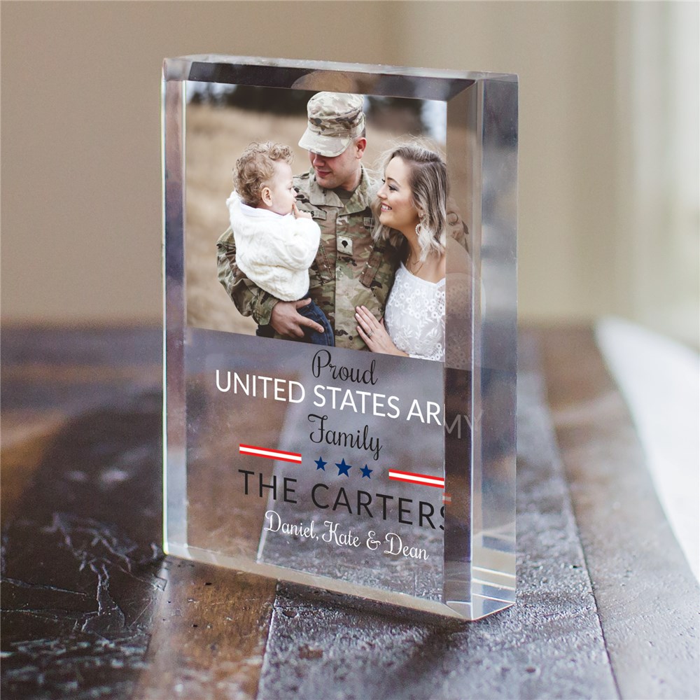 Showcase your best family photo with your military family member in uniform with our Personalized Stars & Stripes Proud Family Photo Acrylic Keepsake.