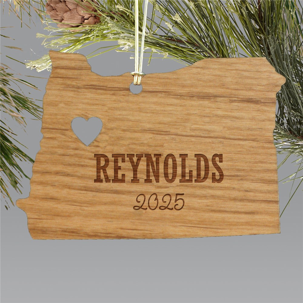 Your ornament, carved in the shape of your choice of any of 20 states, will be personalized with any family name and any year.