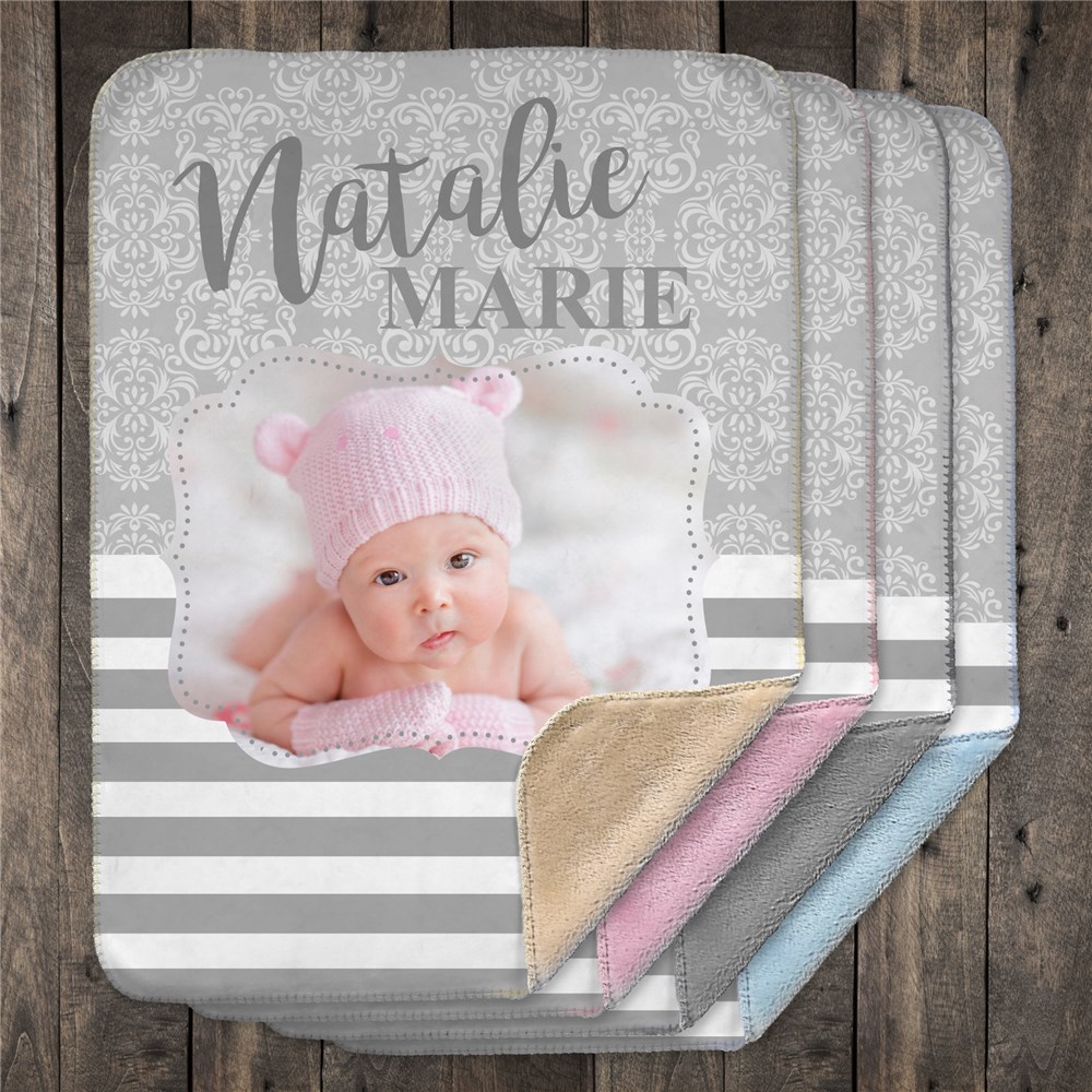 Our Striped Sherpa Photo Personalized Baby Blanket is a great gift for the newest bundle of joy! We will custom personalized with any photo, first name and middle name. Personalized baby blankets like this one makes a perfect gift for any new baby!