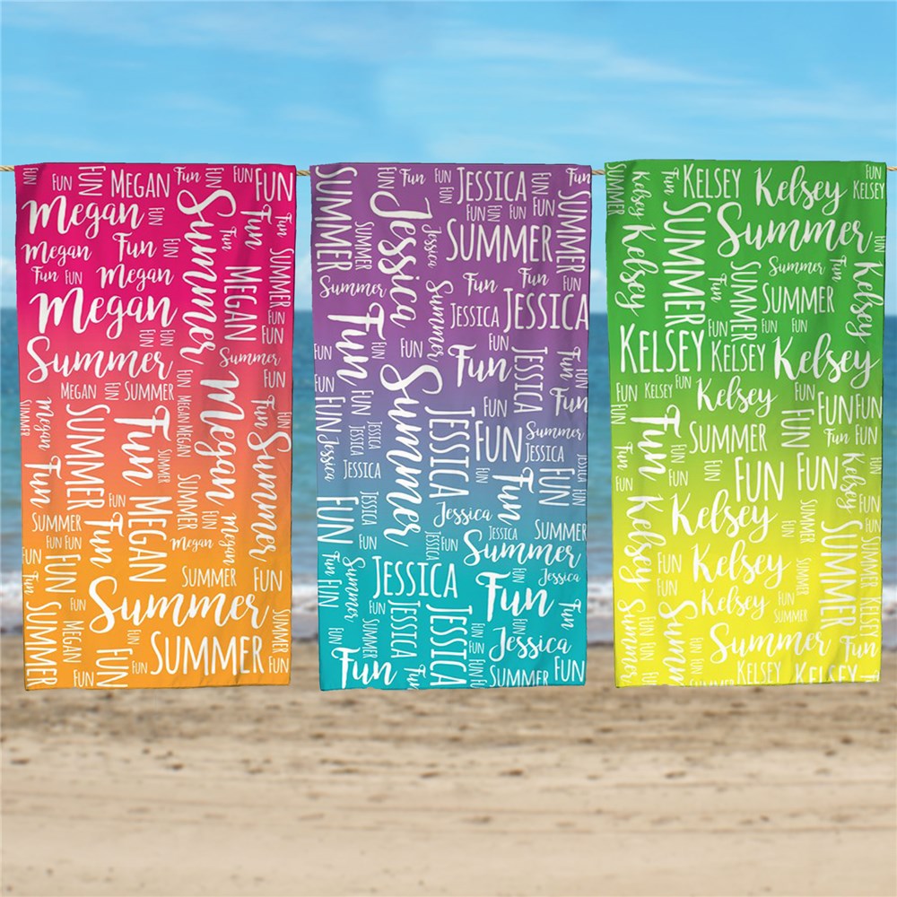 Our Personalized Summer Fun Gradient Word Art Sand-Free Beach Towel will make any beach trip even better.