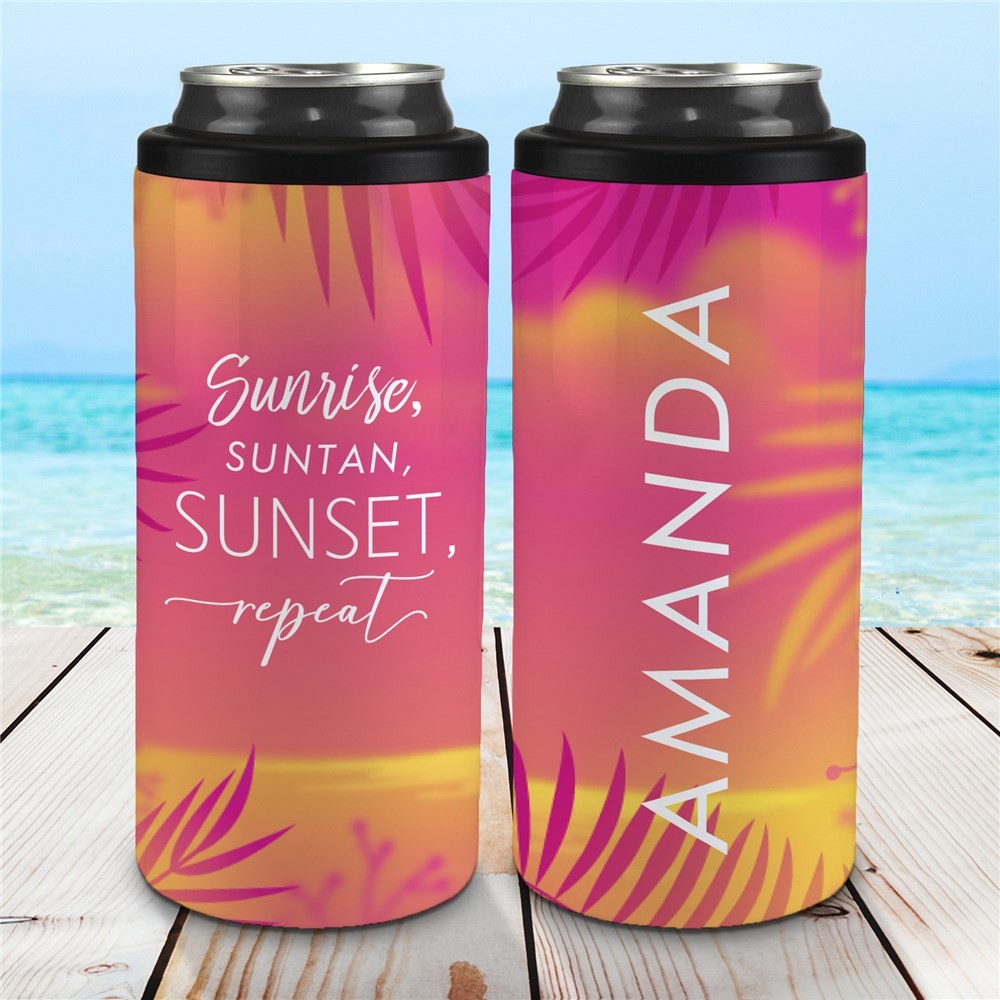 Our Personalized Sunrise, Suntan, Sunset, Repeat Slim Can Cooler is perfect for keeping your slim can drinks cool this summer.