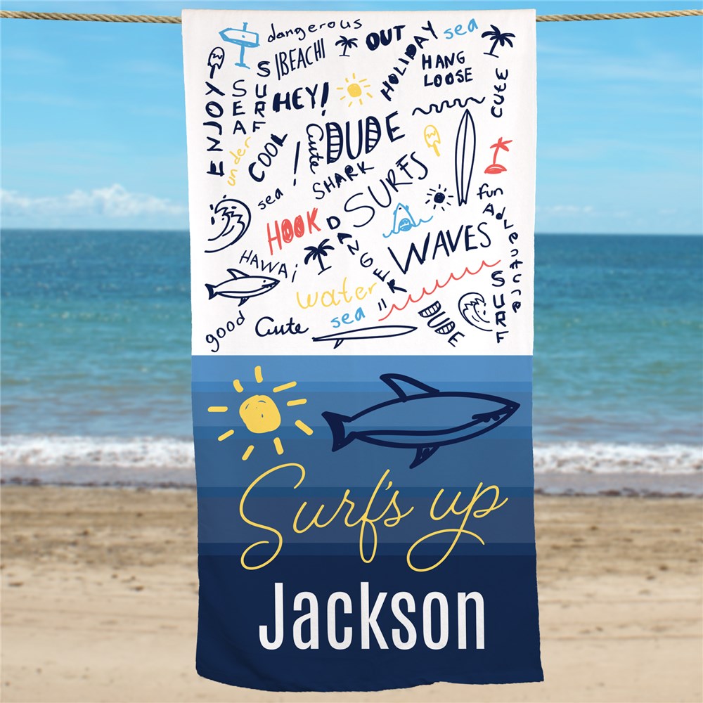 Catch some waves at the beach and dry off with our Personalized Surf's Up Beach Towel.