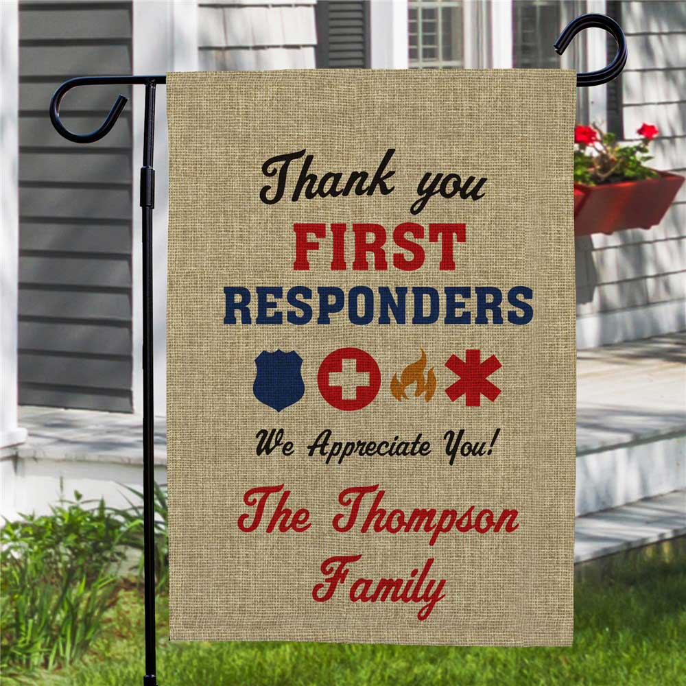 Show your family's appreciation for first responders with our Personalized Thank You First Responders Icons Burlap Garden Flag.