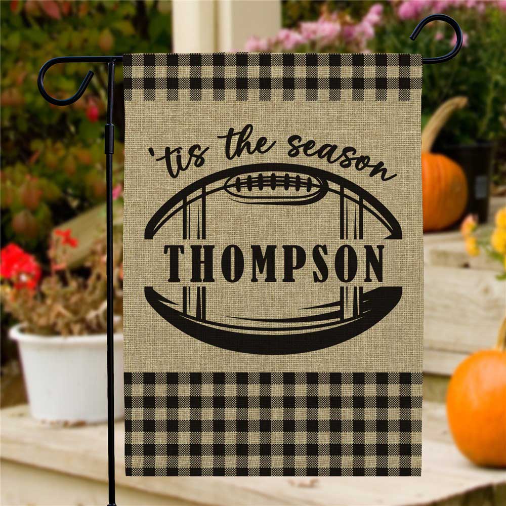 This football garden flag can be personalized with any family name.