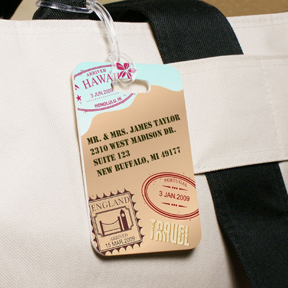 Your Custom Printed Travel Luggage Tag measures 4"H x 2.75"W, made of plastic and includes a clear elastic loop for easy luggage identification. Includes FREE Personalization. Personalized your Travel Luggage Tag with 4 line custom message.