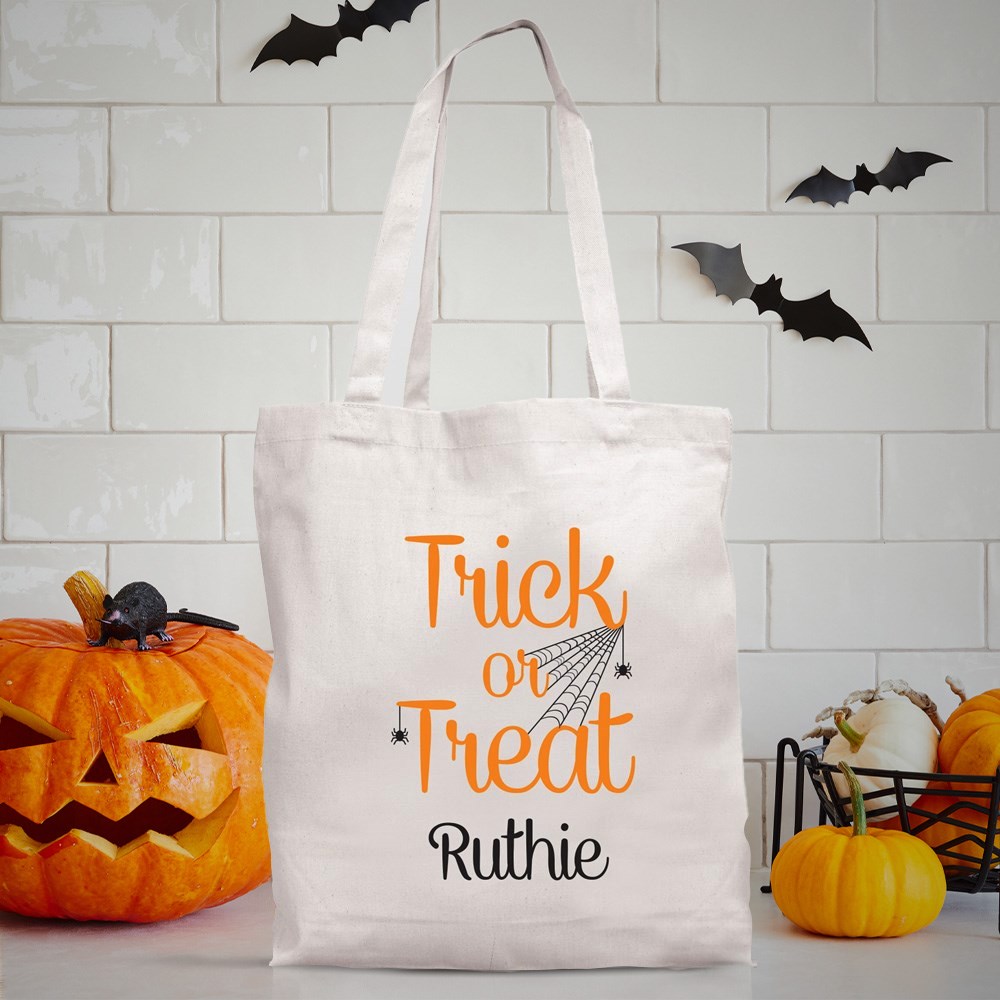 Trick or Treat with our Personalized Trick Or Treat Web White Tote Bag this Halloween. Great for adults and kids alike, the sophisticated design looks great with your Halloween decor and costumes!