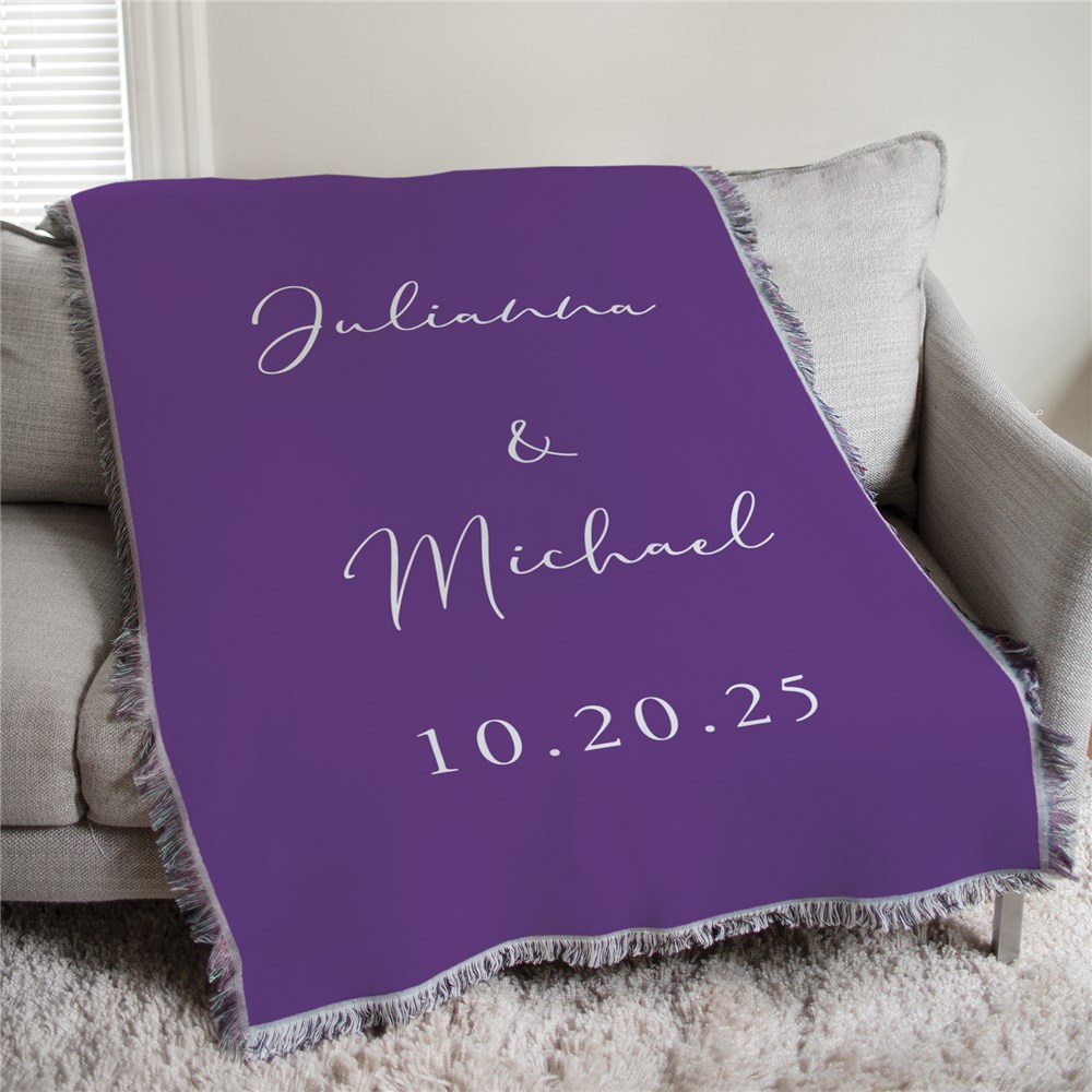 Capture the beauty of your special day with our Personalized Two Names And Date 50x60 Afghan Throw.Ideal for snuggling and displaying, this afghan features both of your names and your wedding date in elegant writing. With 18 rich background color choices, it's a heartfelt gift that perfectly complements any space.