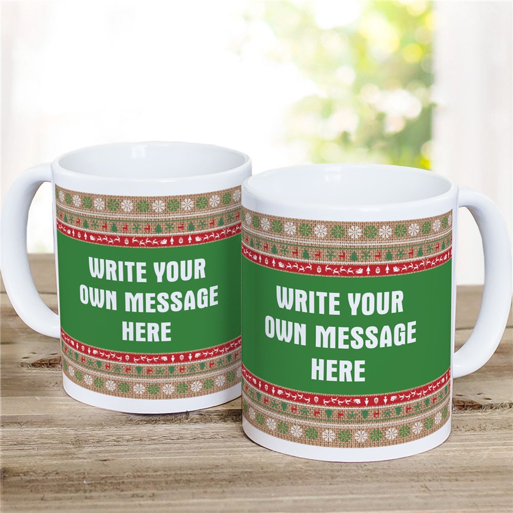 Featuring a traditional "ugly" Christmas sweater pattern in a full wrap design, this mug can be personalized with any 3 custom message lines.