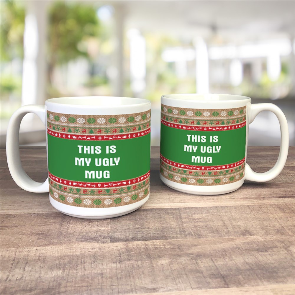 Featuring a traditional "ugly" Christmas sweater pattern in a full wrap design, this mug can be personalized with any 3 custom message lines.