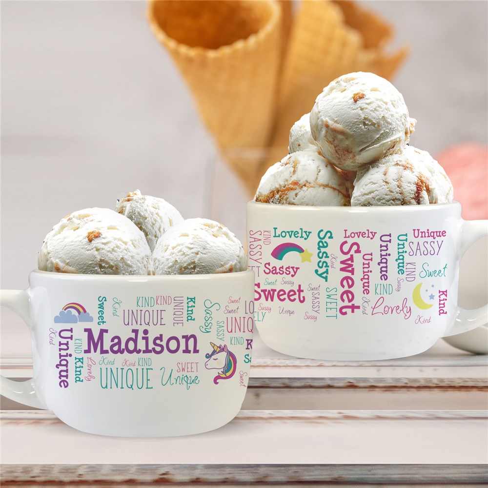 This Personalized Unicorn Word Art Bowl with Handle is a fun way for your little girl to enjoy a delicious bowl of ice cream (or another dessert) in style.