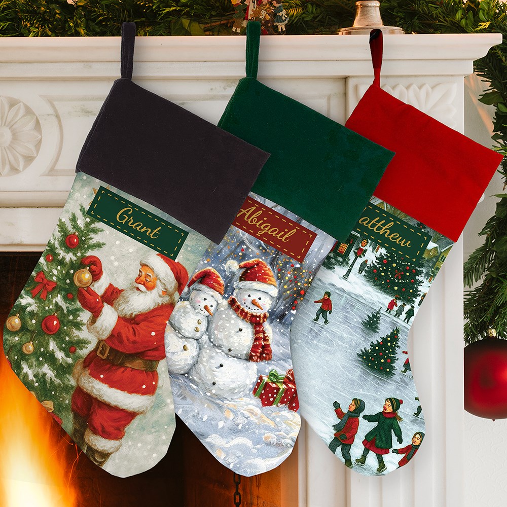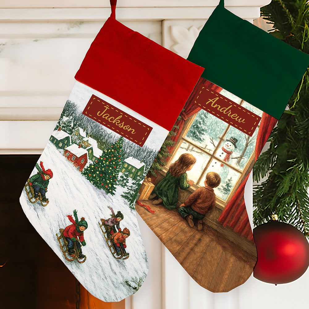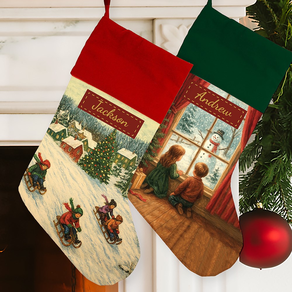 Add a touch of nostalgic charm to your holiday décor with our Personalized Vintage Scene Christmas Stocking. Each stocking features a beautifully illustrated holiday scene — choose from Sledding, Snowman, Town, Santa, or Tree — bringing classic Christmas spirit to your mantel. Every stocking is personalized with your chosen name in elegant gold, making it a truly special keepsake for the season.