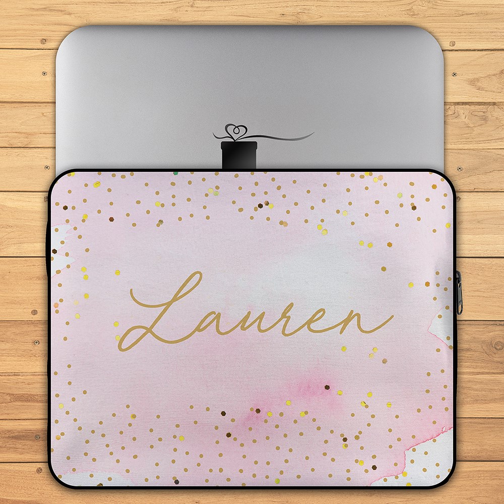 Add a touch of elegance to your every day essentials with this stylish Personalized Watercolor Dots Laptop Sleeve. Featuring a soft pink watercolor wash and shimmering gold dot accents, this sleeve is personalized with any name in a graceful script font, making it uniquely yours. Whether you're heading to work, school, or traveling light, this sleeve keeps your laptop protected while showing off your personal style.