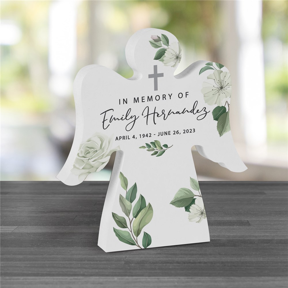 Adorn your desk, tabletop or shelf with a lovely reminder of your loved one with our Personalized Watercolor In Memory Of Angel Shaped Sign.