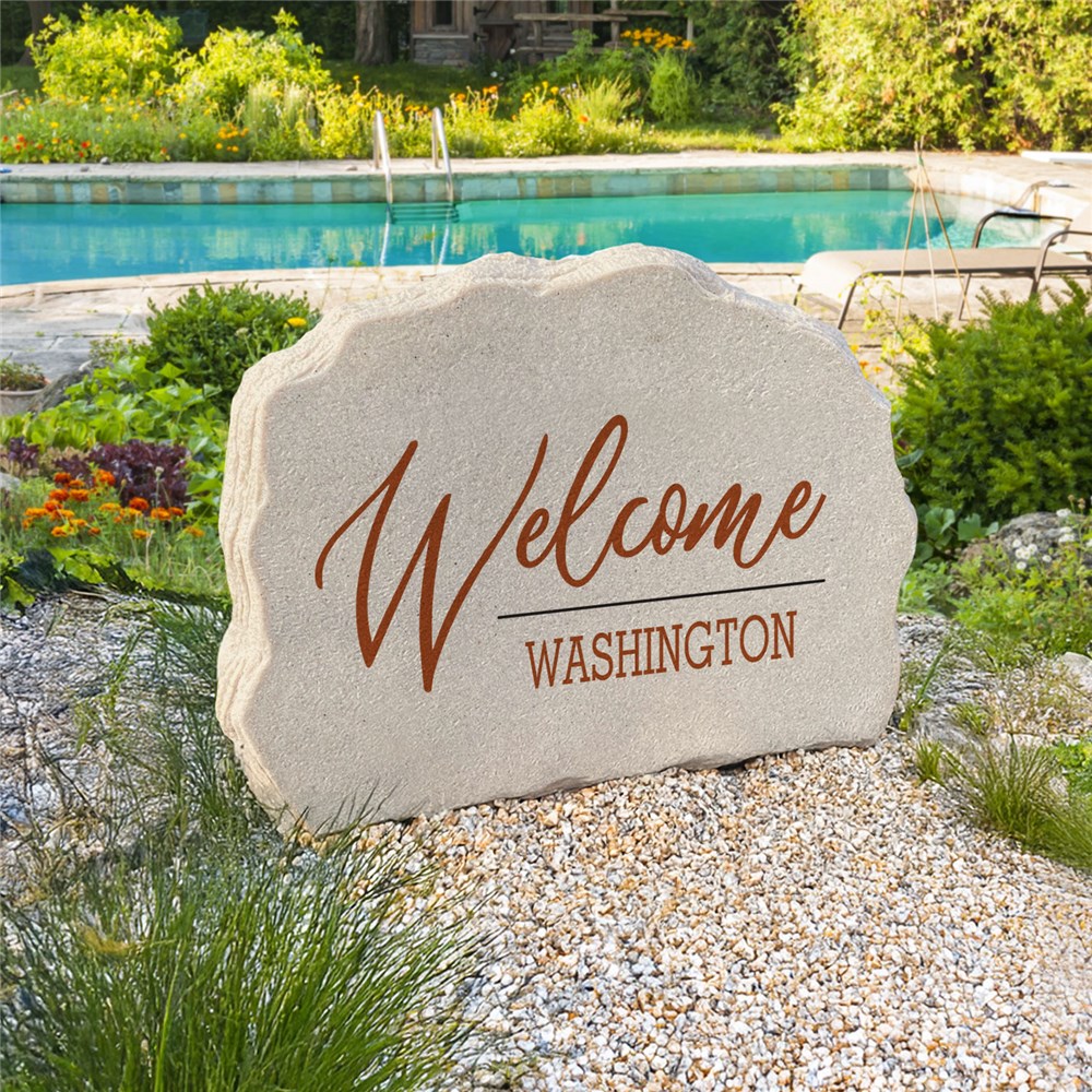 Greet guests in style with our Personalized Welcome Address Standing Garden Stone. Available in your choice of 8 colors, this beautifully designed stone features the word “Welcome” in a bold script font with space below for your personalized message or address. Crafted to look like natural stone, it’s durable, lightweight, and perfect for outdoor display all year long.