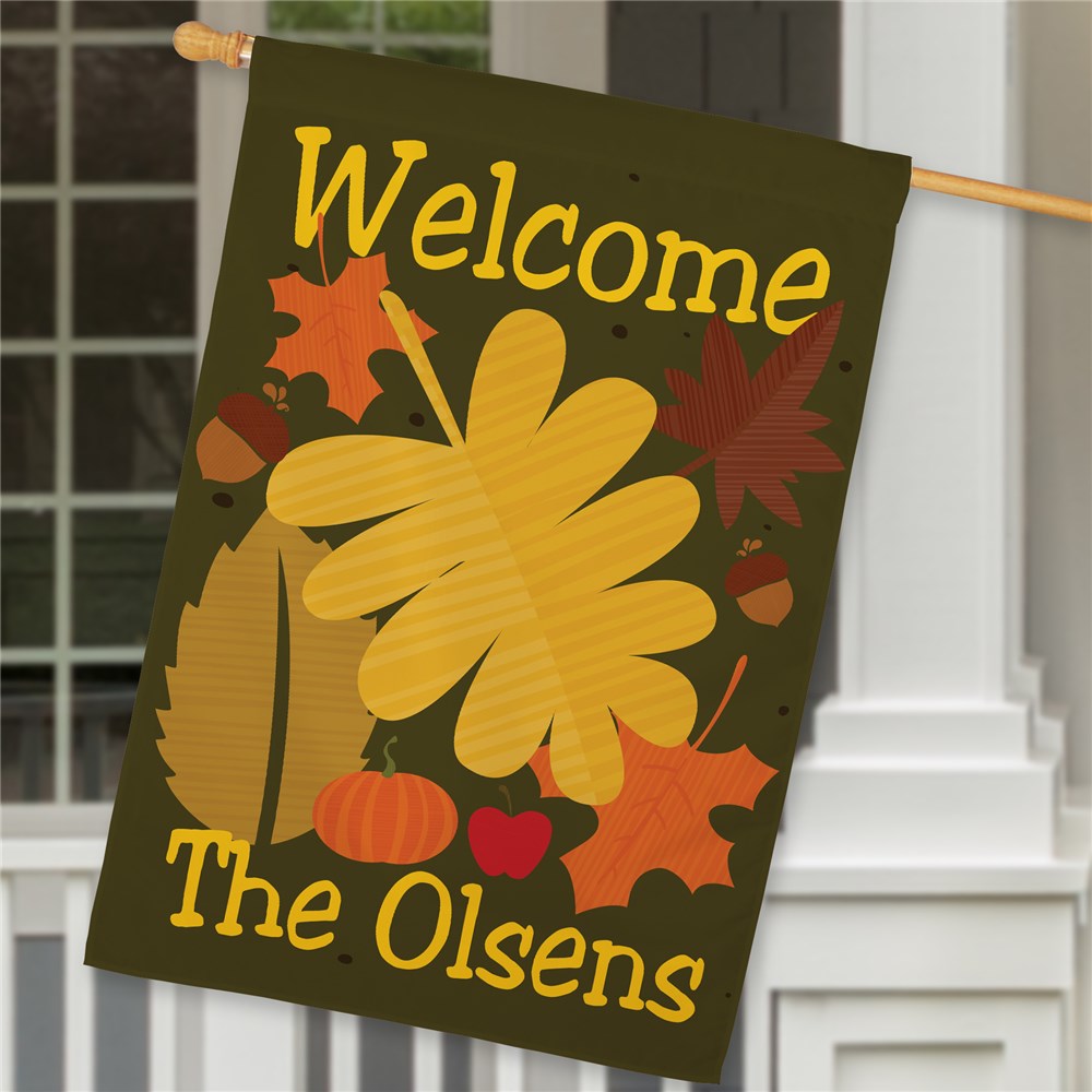 Create a colorful accent piece to your front entrance when you display this Personalized Welcome Fall House Flag. Our Fall Greetings Personalized House Flag brings out the beautiful fall colors of your home and gives a warm welcome to anyone who visits. Personalize your House Flag with any one line custom message.