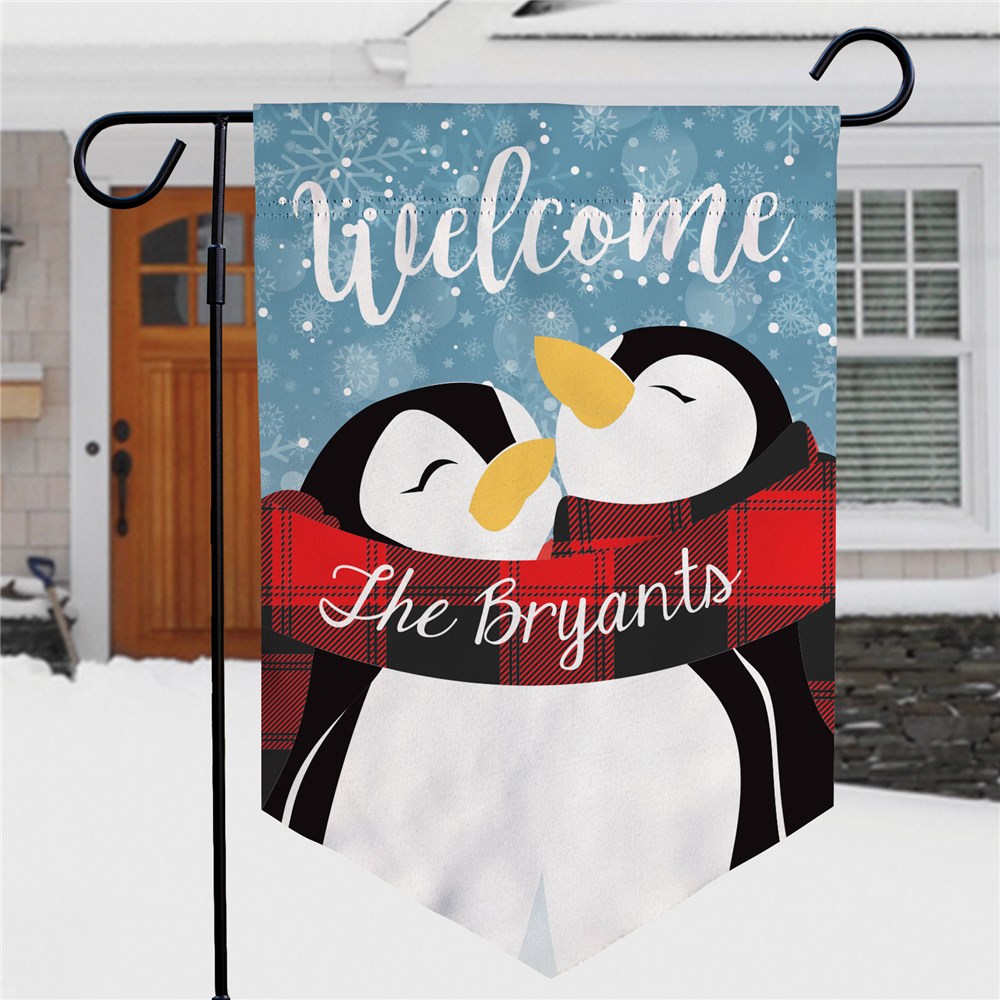 Greet your guests with a cheerful winter welcome when you display our Personalized Welcome Hugging Penguin Couple Pennant Garden Flag outside this holiday season.
