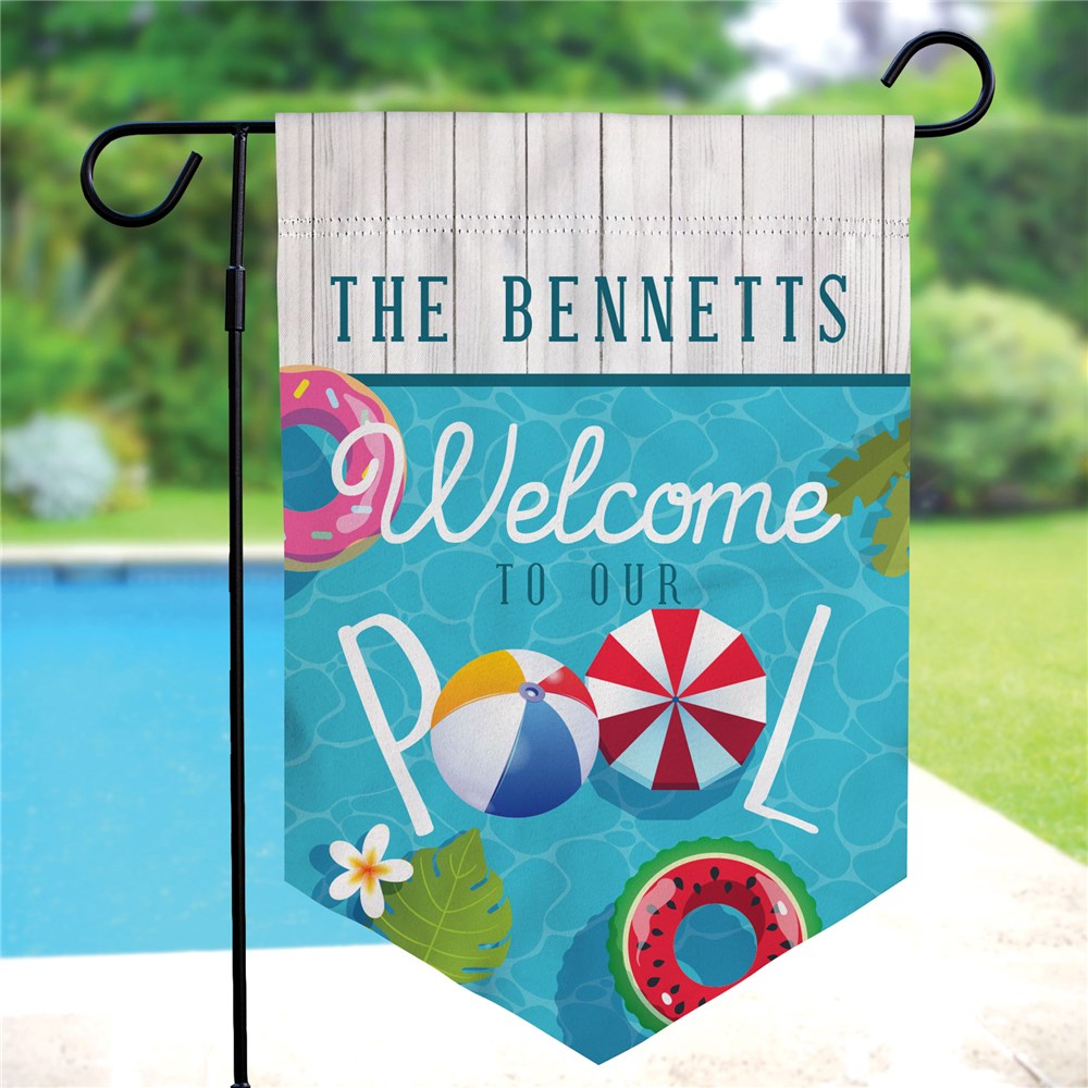 Display our Personalized Welcome to Our Pool Pennant Garden Flag in your yard this summer to let guests know the pool is open!