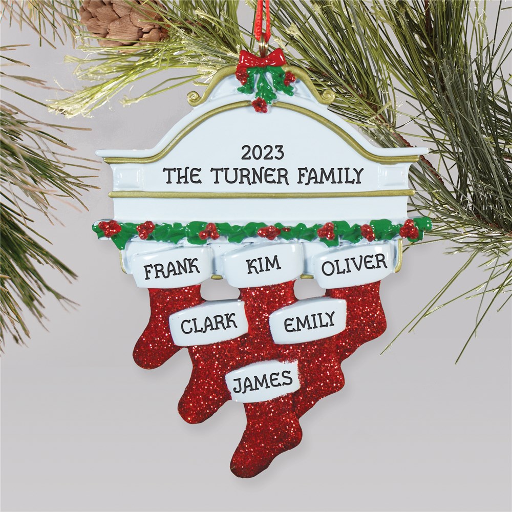 You will surely cherish our personalized White Mantel ornament year after year! Personalized Family Christmas Ornaments can have anywhere from 2 to 6 custom glittering stockings. Each of the stockings on this custom Christmas ornament can be personalized with any name for no additional charge.