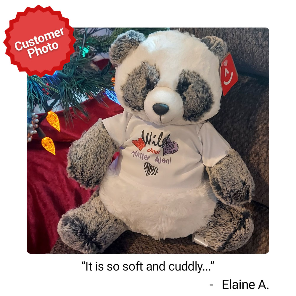 Super soft, cuddly and romantic, this Plush Bear is the ideal gift to give your sweetheart. Whether you're celebrating an anniversary, Valentine's Day, Sweetest day or any romantic occasion, this Plush Bear is sure to help get the sparks flying! This romantic design is featured on our Ping Bear. Ping is a very cute, soft, cuddly and squishy panda with super soft grey and white fur. With a loveable expression, this romantic bear makes a great gift for anyone on your shopping list. The T-shirt worn by Ping features our “Wild About Design”. Free personalization of any name is included. Ping measures 12”.