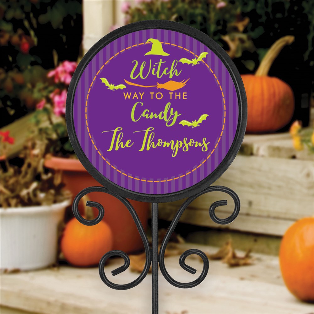 Complete your outdoor Halloween decorations with our Personalized Witch Way to the Candy Round Magnetic Sign Set!