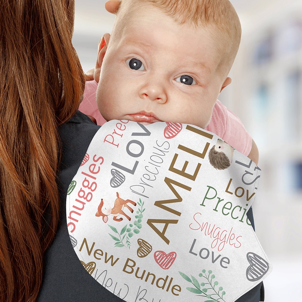 Any family with a newborn will get plenty of use out of our Personalized Woodland Word Art Baby Burp Cloth.