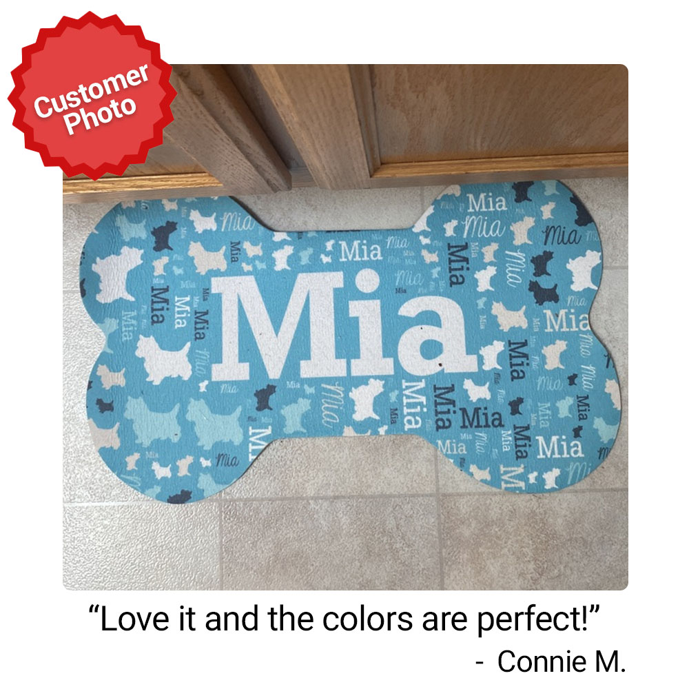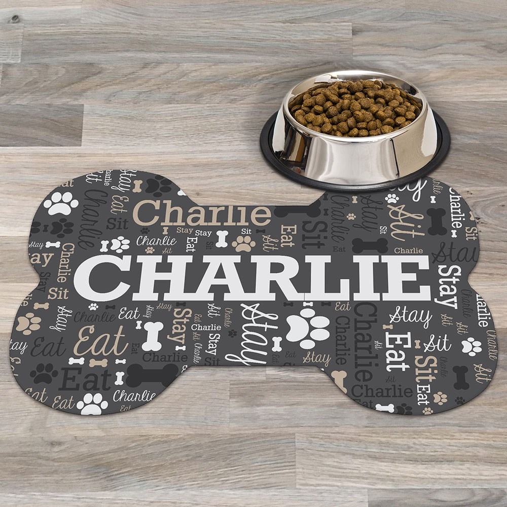 Our Personalized Word-Art Dog Bone Shaped Mat is a cute addition to your kitchen for your dog's bowls.