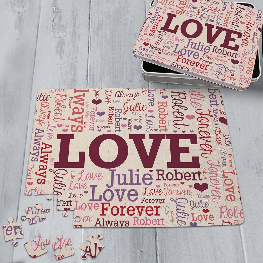 Love will fill the air as you put together this Personalized Word-Art Puzzle With Tin with someone special.