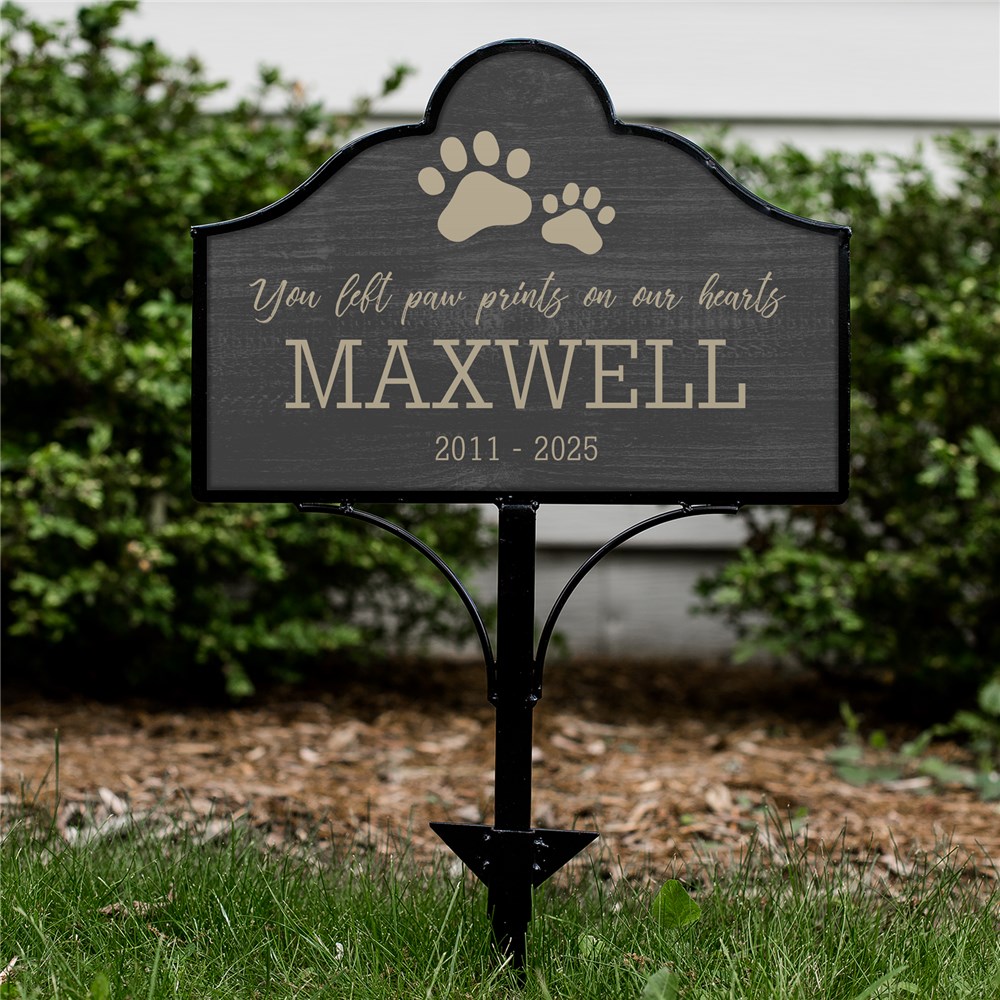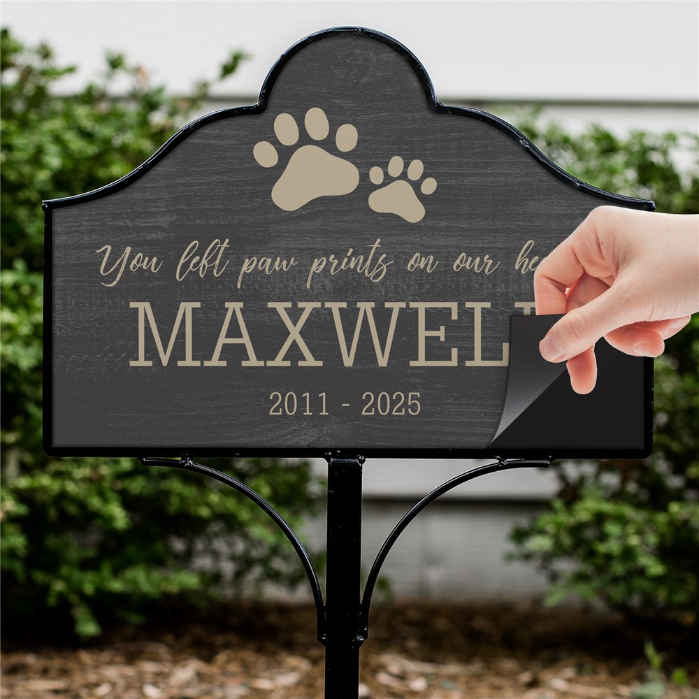 Personalized You Left Paw Prints On Our Hearts Magnetic Sign Set can be placed in your yard in honor of your pet.