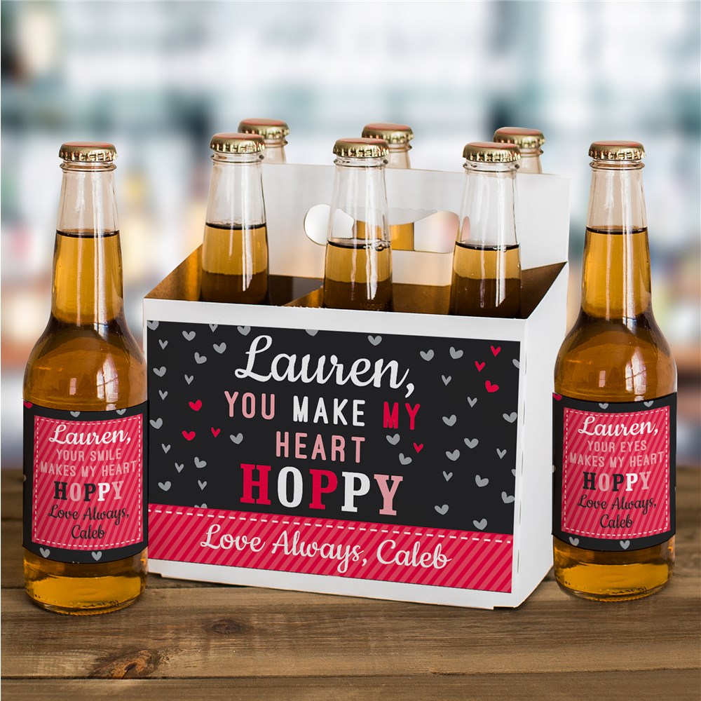 Surprise your love with their favorite beer this Valentine's Day with our Personalized You Make My Heart Hoppy Beer Carrier and Labels Set.