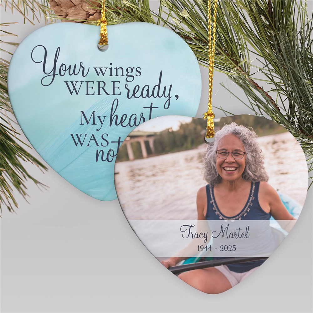 Hang this Personalized Your Wings Double Sided Heart - Shaped Ornament on your tree to commemorate the life your loved one lived.