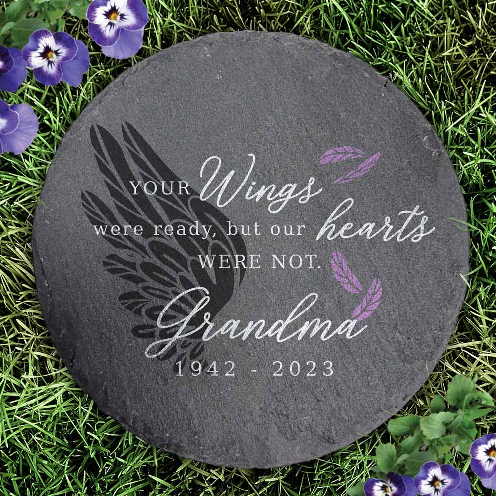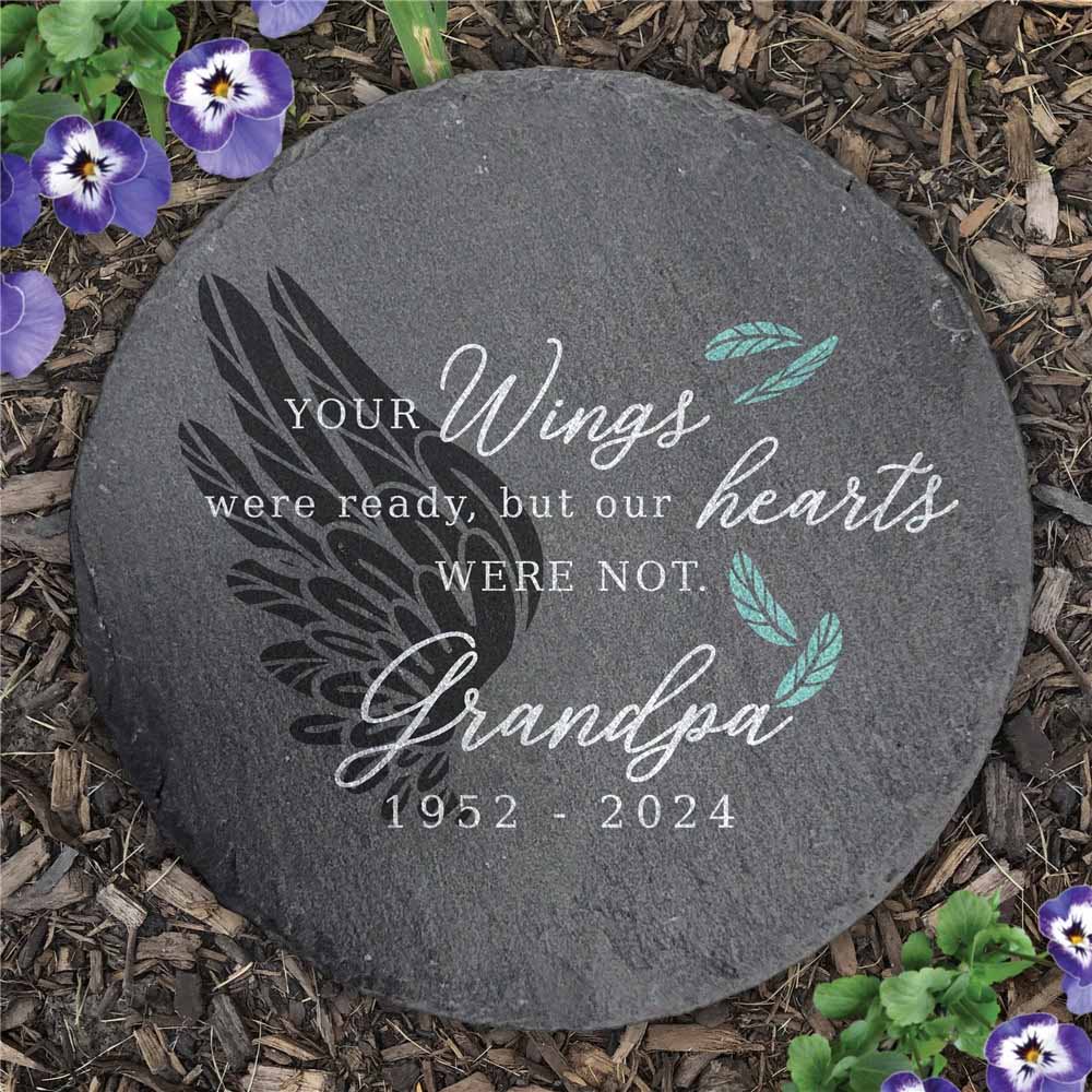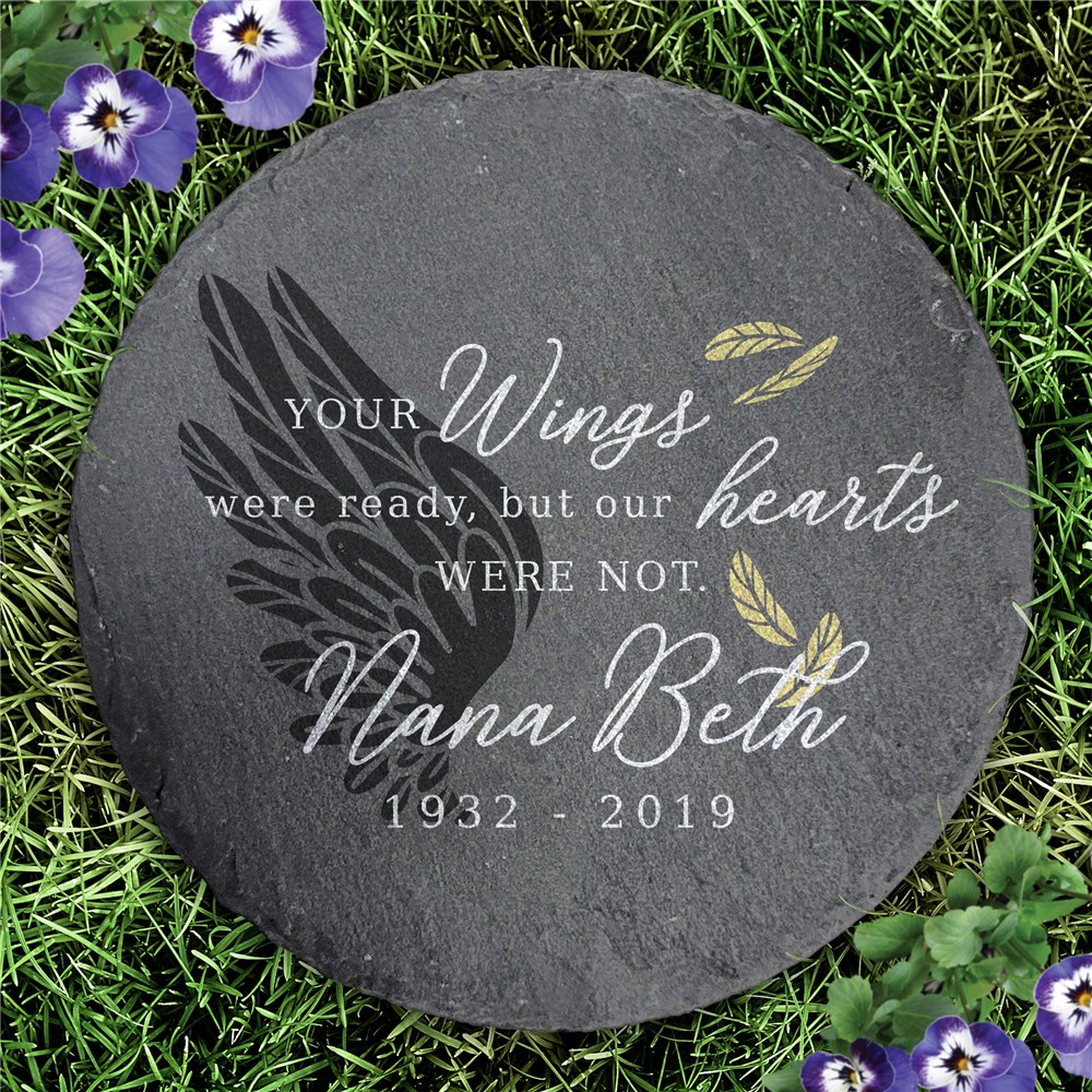 Mark the site with our Personalized Your Wings Were Ready Round Slate Stone.