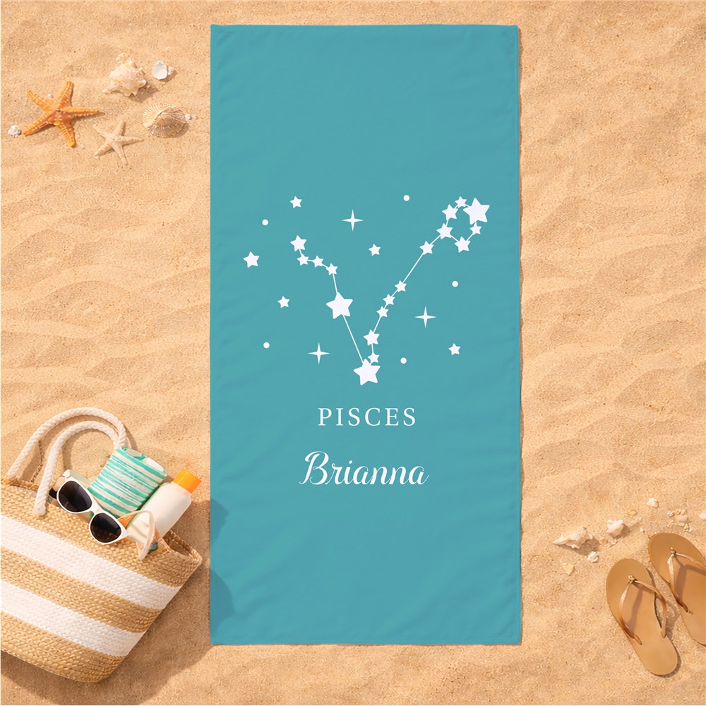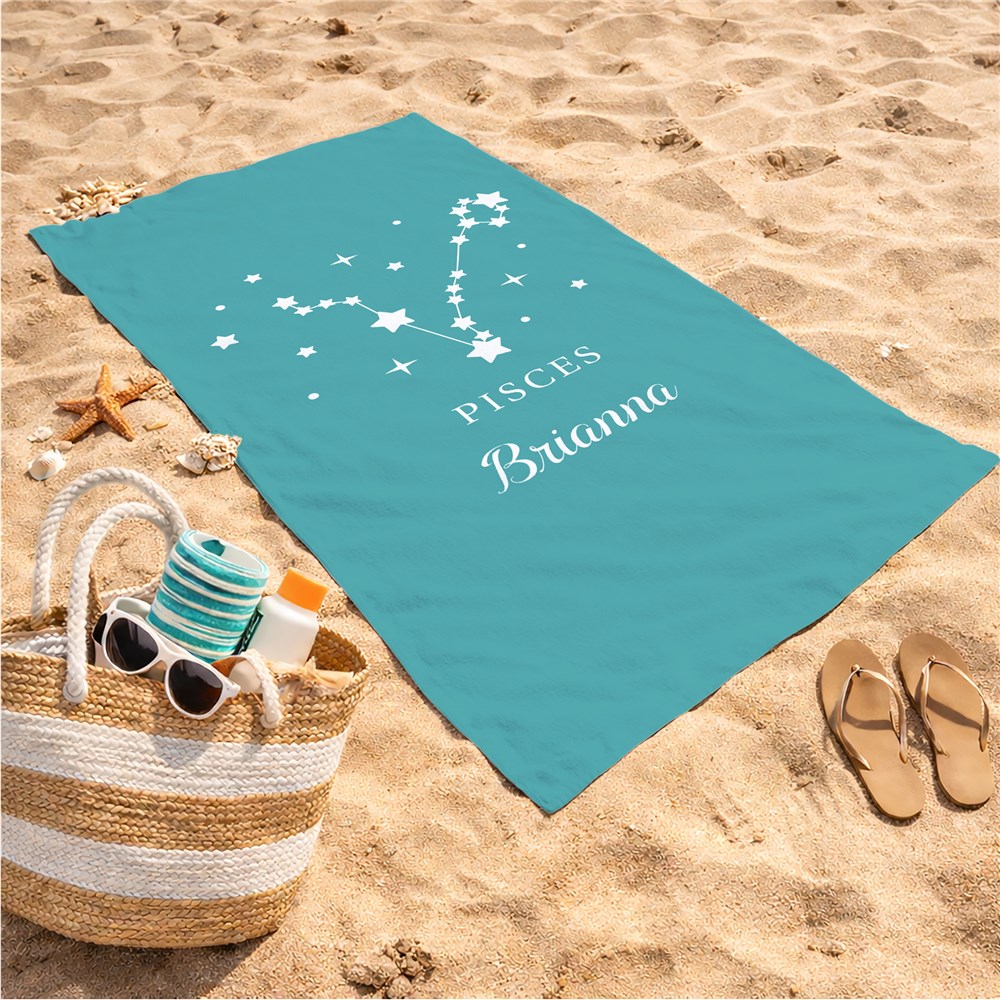 Personalize this beach towel with your choice of background color, zodiac sign and any name for a unique gift.