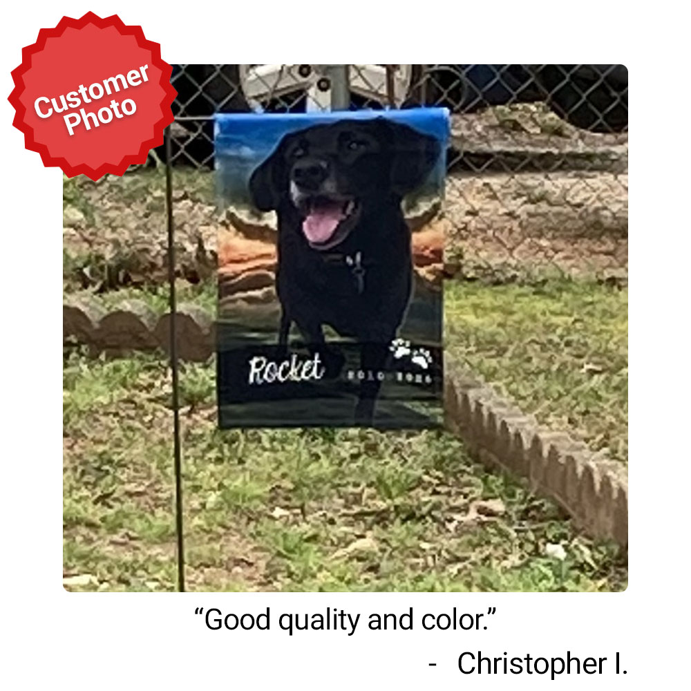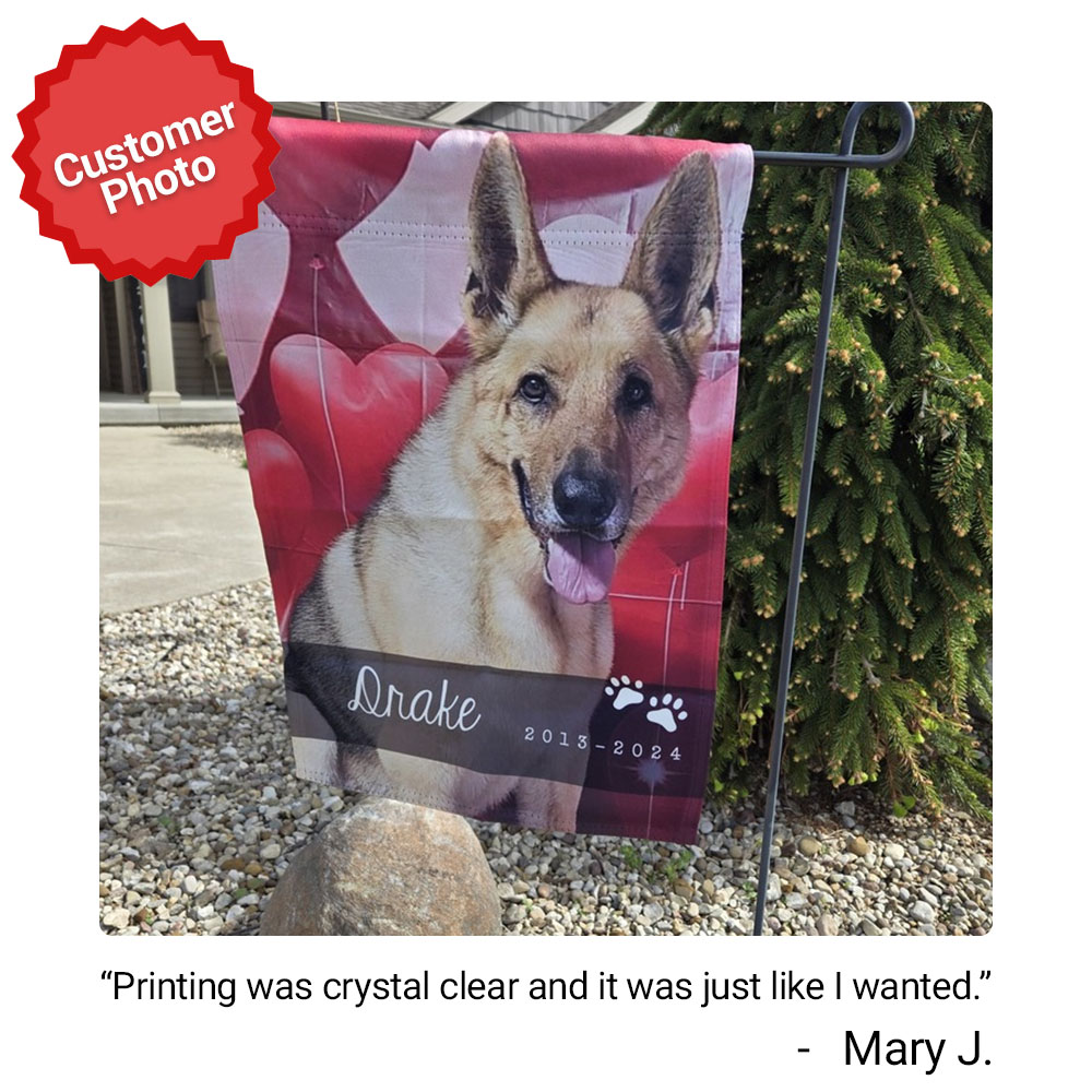 Honor the life your pet has had with a loving photo displayed on our Personalized Garden Flags. This photo Custom Garden Flags create a thoughtful way to cherish the amazing memories you've made and it becomes a treasured keepsake the entire family can pay tribute to. Your photo may be printed on our one sided or double sided, durable, all-weather 100% poly garden flag that measures 12-1/2"w x 18"h. You may wish to display this flag on our optional garden flag pole, door hanger or window hanger, sold separately. Pay respect to your four legged friend by including their name and memorial years.