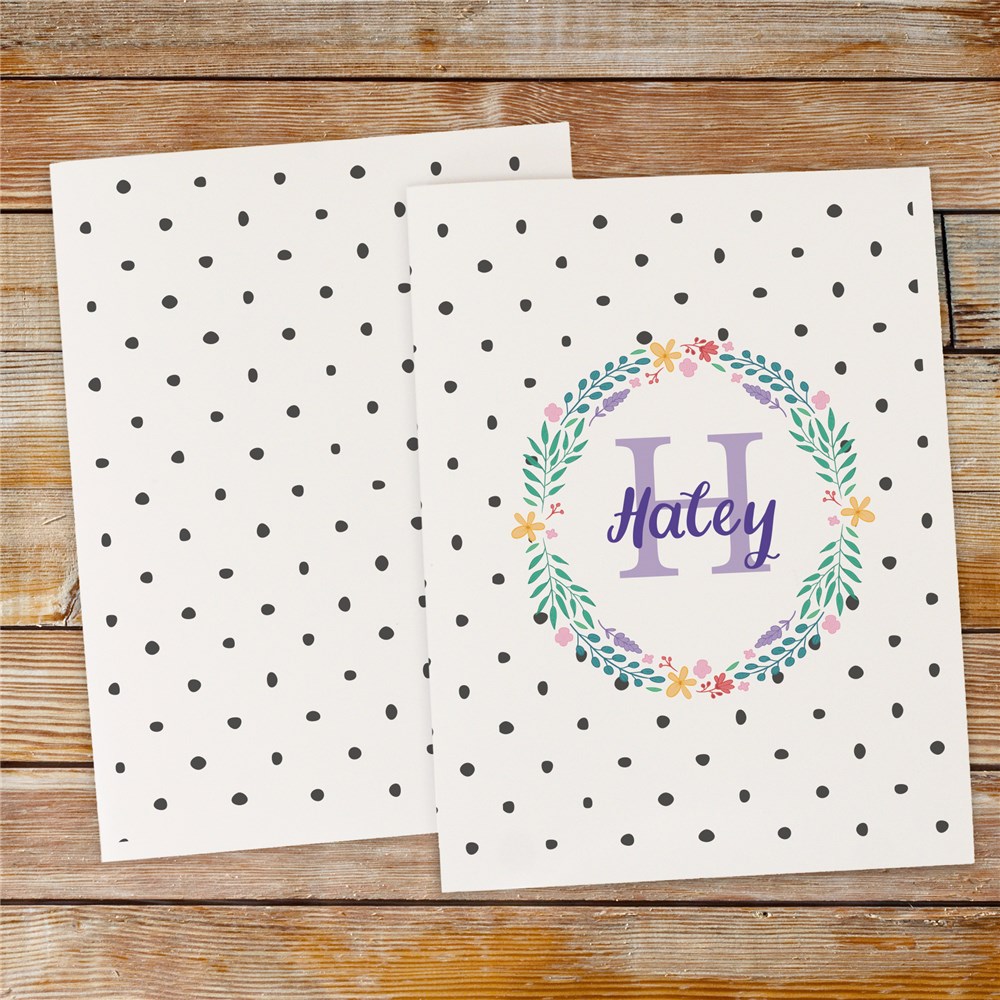 Personalized this wreath polka dot folder with any single initial and any name to make this fun folder set a must have in your backpack!