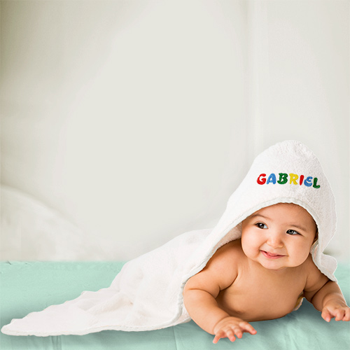 Make bath time extra special by wrapping up your handsome prince or beautiful princess in this Personalized Hooded Baby Towel featuring their name in vivid primary letters embroidered to perfection. A trip to the pool or beach will also be a lot of fun when you dry off your little fish with this absorbent embroidered hooded baby towel. Your Personalized Baby Gifts feature a soft and comfortable hood and each towel is made of 100% cotton loop terry white fabric. Hooded Baby Towels measure 34" x 34". Includes FREE Embroidery. Personalize your Primary Name Hooded Baby Towel with any name. (ie. Gabriel)
