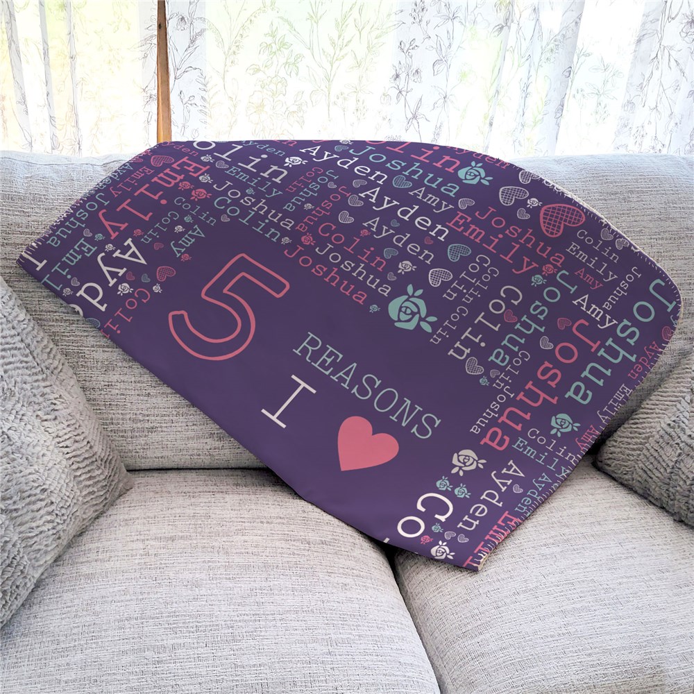 We will create with any title, number of reasons, and any family member's names to make a throw that is completely unique and customized to your home - you choose the color scheme, names and even icons.