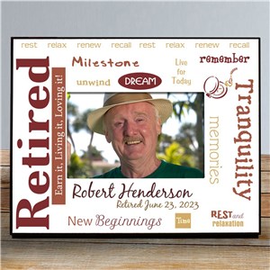Retirement is the perfect time to sit back, relax and rest your tired bones from years of hard work. Take in a movie, head to the golf course or visit with friends to make retirement an enjoyable time. These Retirement Personalized Picture Frames are a wonderful reminder that it is your time to relax and enjoy life to the fullest. These Retirement Customized Picture Frames can be personalized with any name and retirement date.