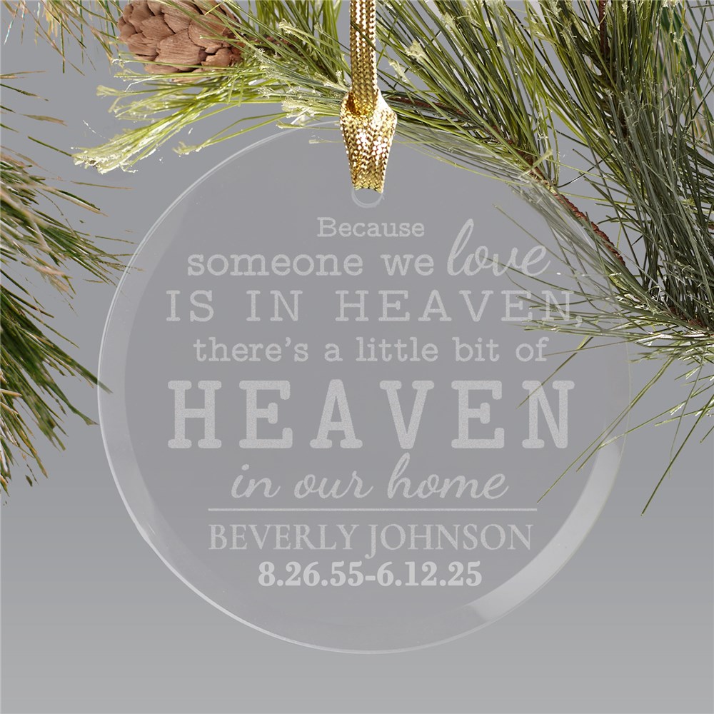 Just because they are no longer on this earth, your loved one's memory lives on in your home. Memorial ornaments personalized with any name are sure to shine bright hanging from any tree. Create a beautiful engraved memorial round glass ornament as a keepsake for a loved one lost. Personalized with any name and birth to at rest dates, this ornament will be a wonderful addition to your holiday tree or an item to hang year round from an ornament hanger (sold separately).