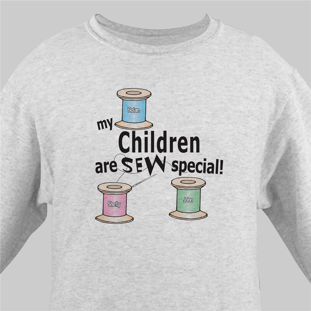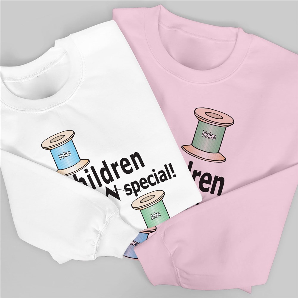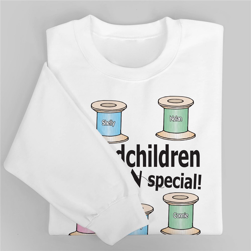 Your quilting shirts are available on our premium white cotton/poly blend sweatshirt, machine washable in adult sizes S-3XL. Quilting shirts include FREE Personalization with any title like children or grandchildren and up to 30 childrens names each with their own pastel colored thread spool. Choose Children, Grandchildren or Nieces or Nephews.