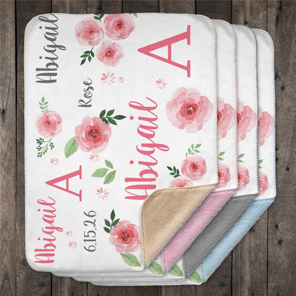 Our pretty Pink Floral Personalized Baby Blanket is a loving gift for a new baby. Featuring lovely watercolor flowers and your baby girl's name and initial and a date, free! We will custom personalized with