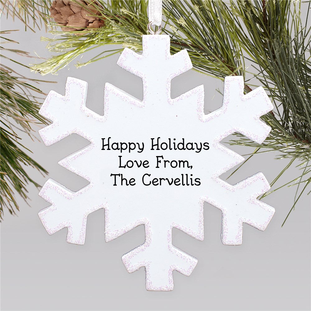 Celebrate this holiday season by hanging this classic snowflake ornament form your tree, or give it to family and friends as a warm and thoughtful Christmas gift idea. This snowflake Personalized Ornament for Christmas is made of a durable resin with glitter detail around the edges and measures approx. 3.5" in diameter. It comes ready to hang with a white ribbon and includes free personalization of any three line custom message.