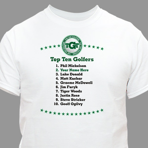Golf is a game of passion, discipline and tradition. Give your passionate golfer one of these Top Ten Golfers Personalized T-Shirts showing that your favorite golfer belongs among the finest golfers in the world. Our Top Ten Golf Personalized Shirt is available on our premium white 100% cotton T-Shirt in adult sizes S-3XL. Each machine-washable Personalized Golf gift shirt is also available in Ash Gray. Golfer gift ideas include FREE Personalization! Personalize your Top Ten Golfers T-Shirt with any golfer's name.