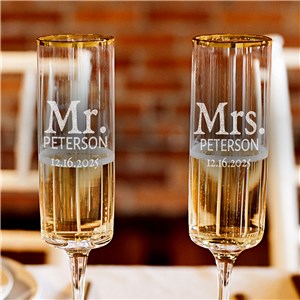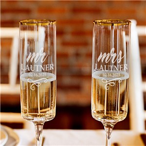 .Engraved Mr. and Mrs. Gold Rim Champagne Flutes