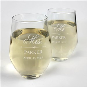 .Engraved Mr. And Mrs. Contemporary Stemless Wine Glass Set
