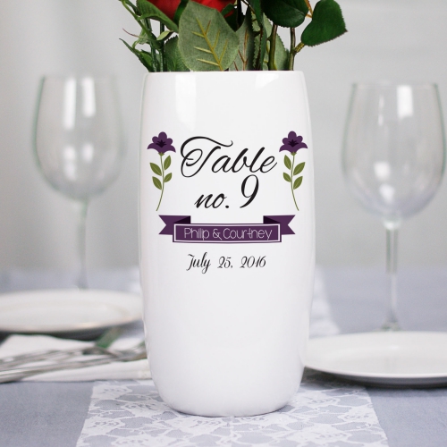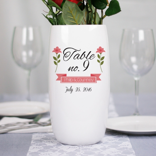 From classic to elegant and charming to chic, this personalized vase gives you the best of both worlds, a table number setting to a beautiful centerpiece. It is well designed and fits perfectly with your shabby chic wedding decor. Personalized with any couples' names, table number, date and wedding color.