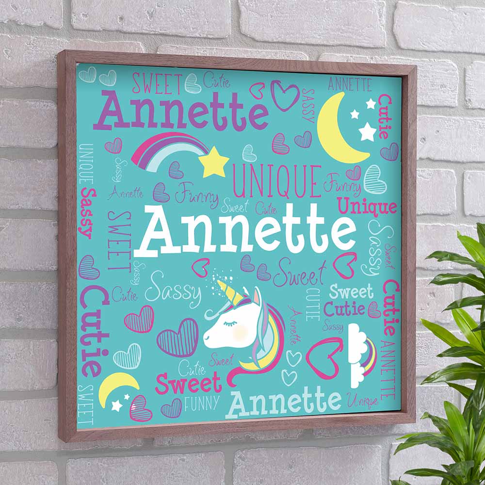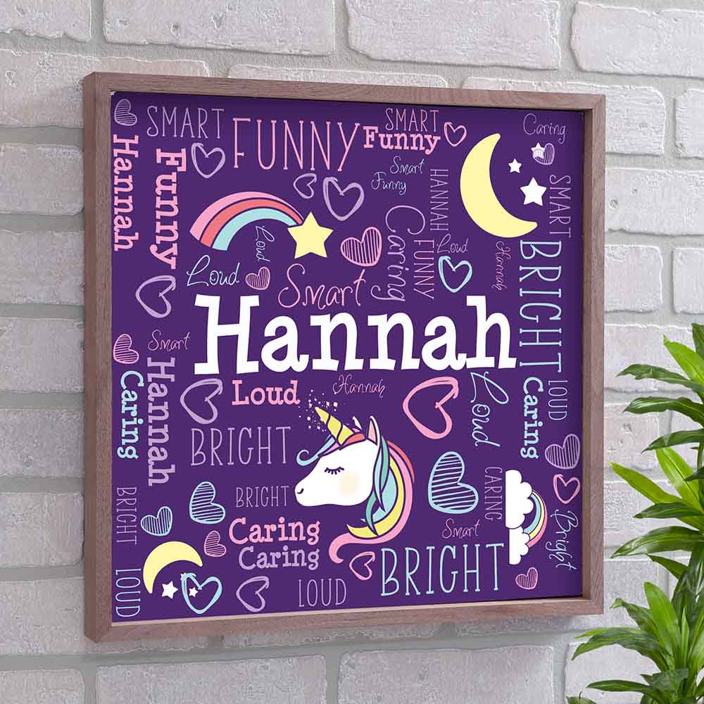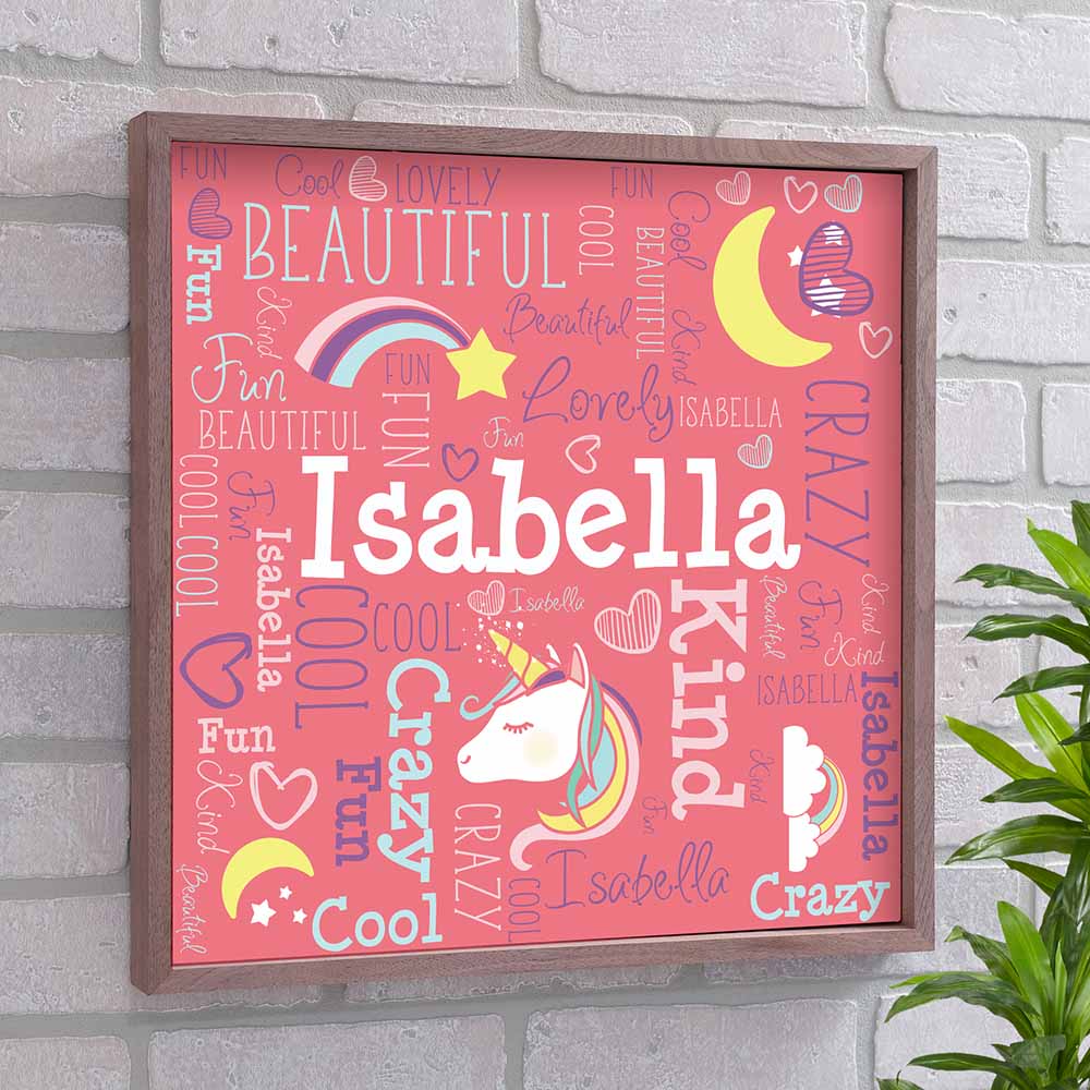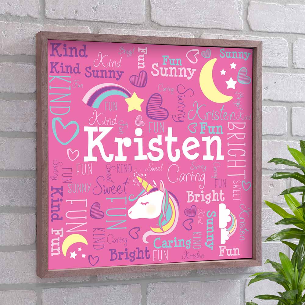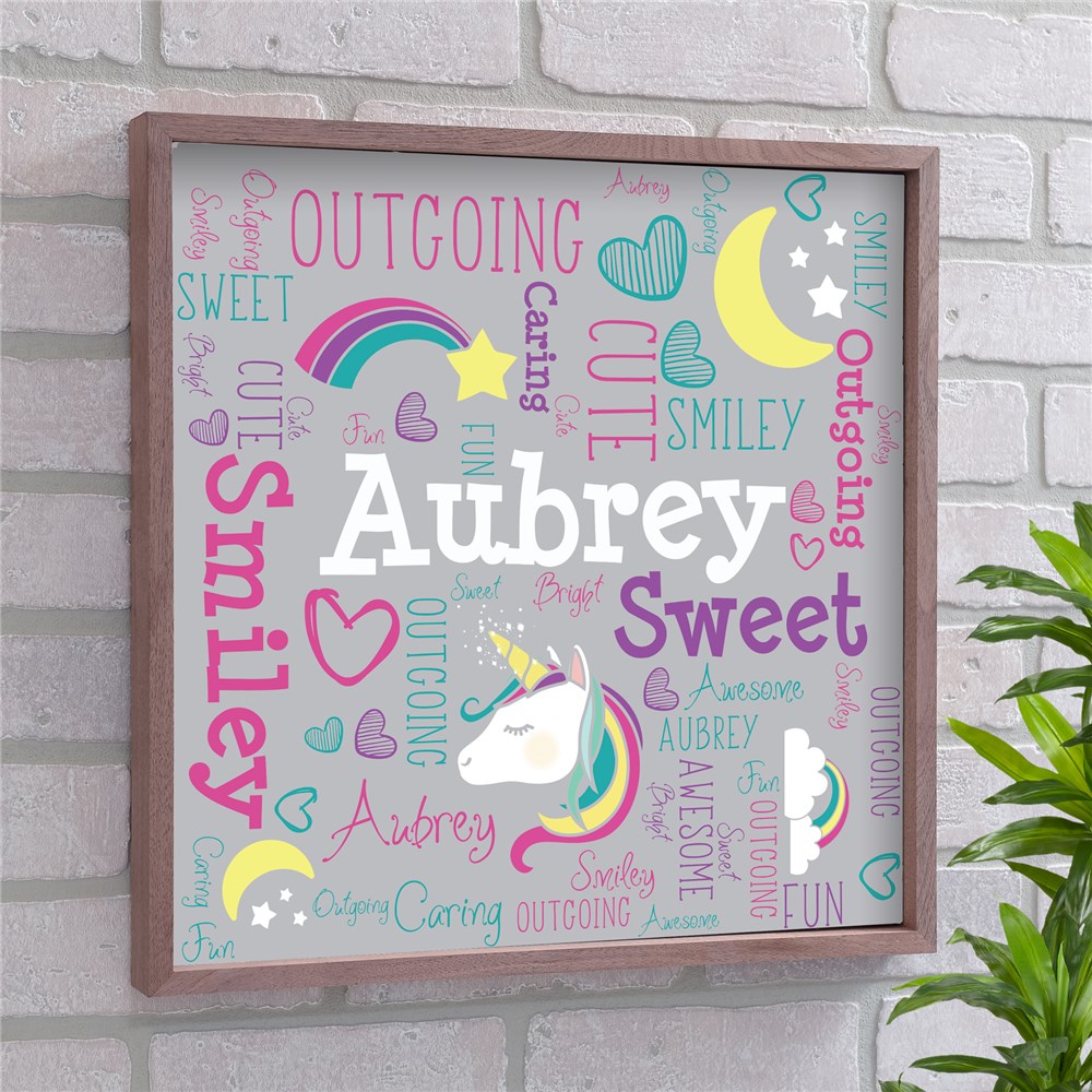 Give a unique gift to your daughter, niece or another favorite little girl with our Word Art Personalized Unicorn Kid's Wall Decor. Featuring her name, some great words, phrases and icons like rainbows, hearts and more.