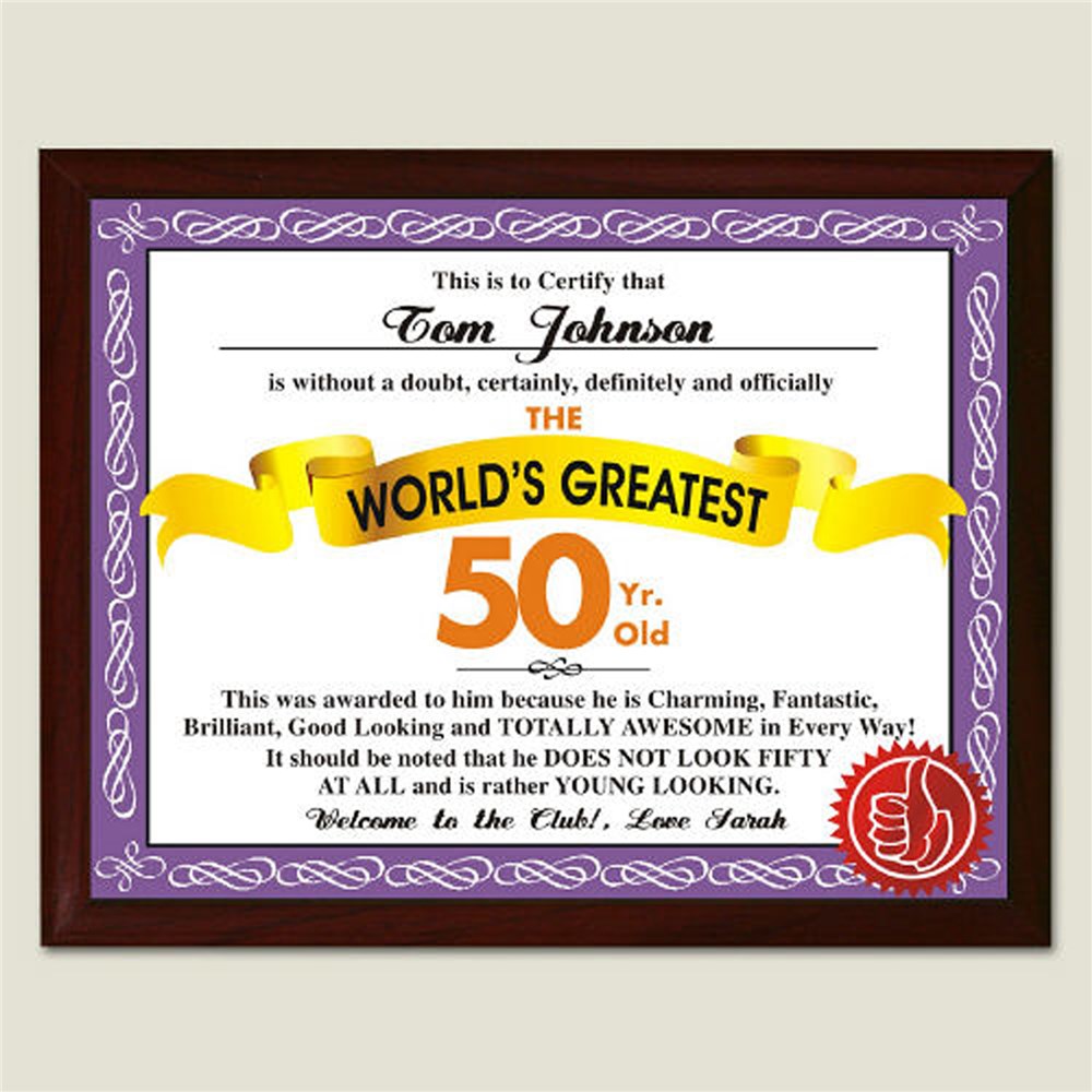 Our Custom Printed 50th Birthday Award includes FREE Personalization. This personalized birthday plaque measures 8" x 10" and contains slotted holes for easy wall mounting. Personalize your World's Greatest 50th Birthday Plaque with any name and any ending 1 line custom message.  Please specify her or him.